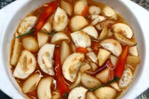 Cà dầm dấm tỏi với cà giòn ngon, tỏi thơm lừng, gia vị chua ngọt đậm đà.