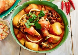 Gà nấu cà ri với thịt gà mềm, nước cà ri đậm đà, hương vị đặc trưng.